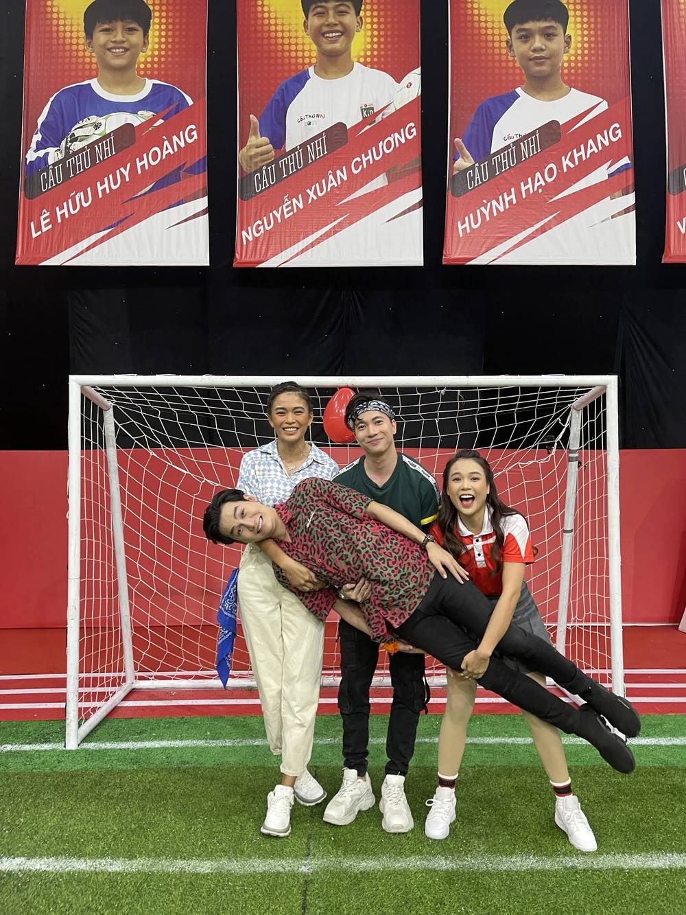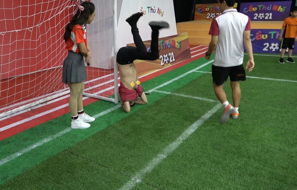 Đội trưởng đội Cam còn thử tạo dáng trồng cây chuối ở khung thành và bị ngã lộn nhào ra sau khiến ai cũng bật cười.