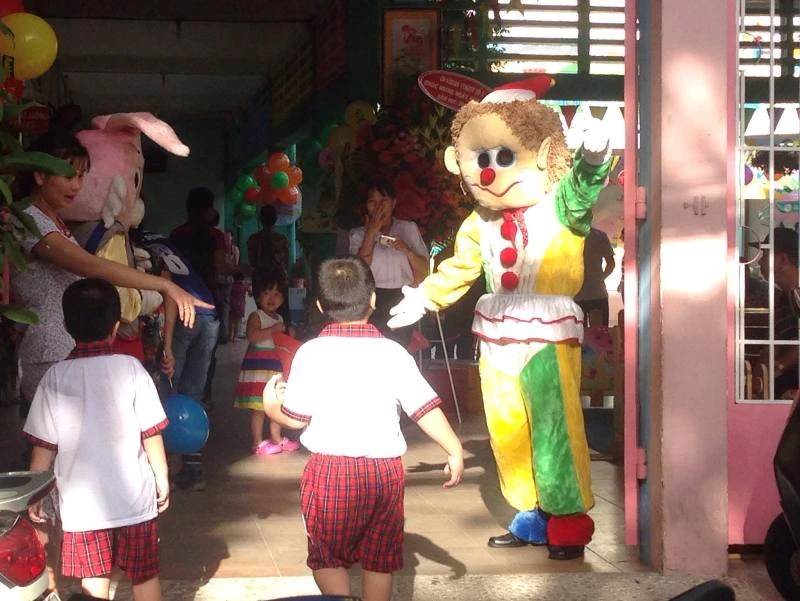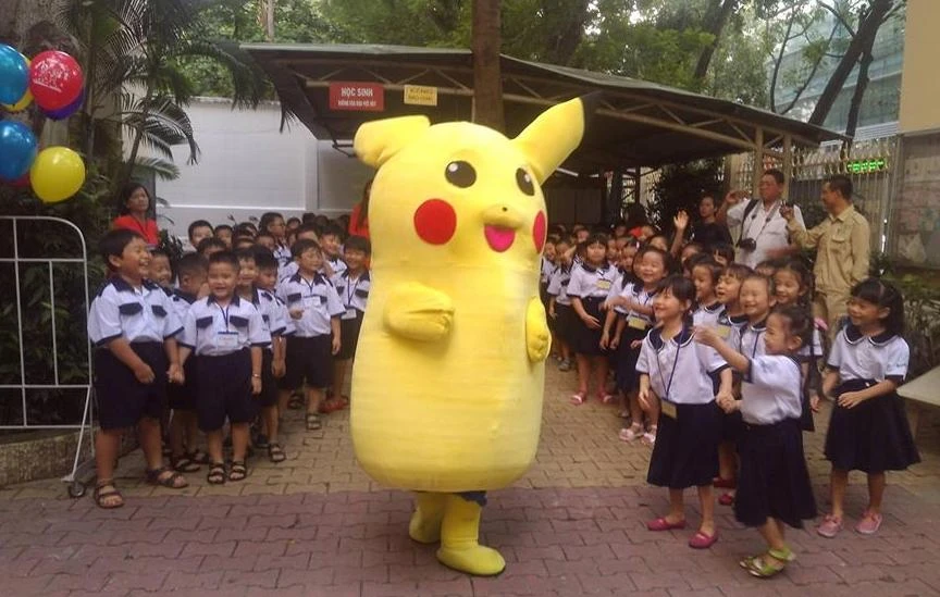 Các bé lớp 1 trường Trần Quốc Thảo, quận 3, TP.HCM háo hức cùng "bạn" Pikachu trước giờ vào dự lễ khai giảng. Ảnh: Trí Nhiên