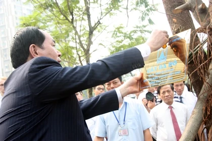 Chủ tịch nước tham gia nhiều hoạt động trong ngày khai giảng, trong đó có trồng cây lưu niệm tại khuôn viên nhà trường. Ảnh: PHI HÙNG