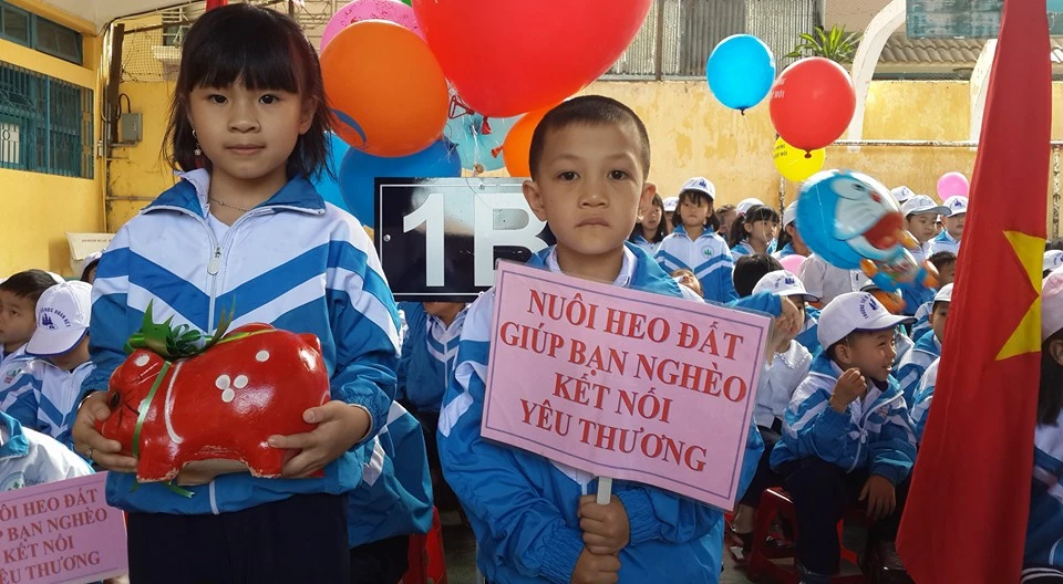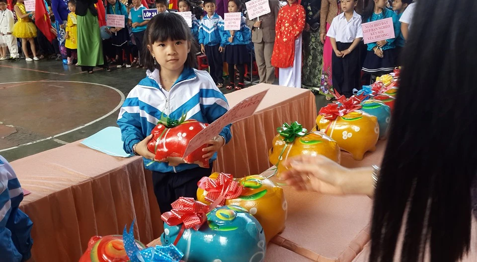 Các bé học sinh trường tiểu học Đoàn Kết (TP. Đà Lạt, Lâm Đồng) hưởng ứng phong trào nuôi heo đất giúp bạn nghèo ngay trong Lễ khai giảng. Ảnh: Cô giáo Lê Mỹ Liên