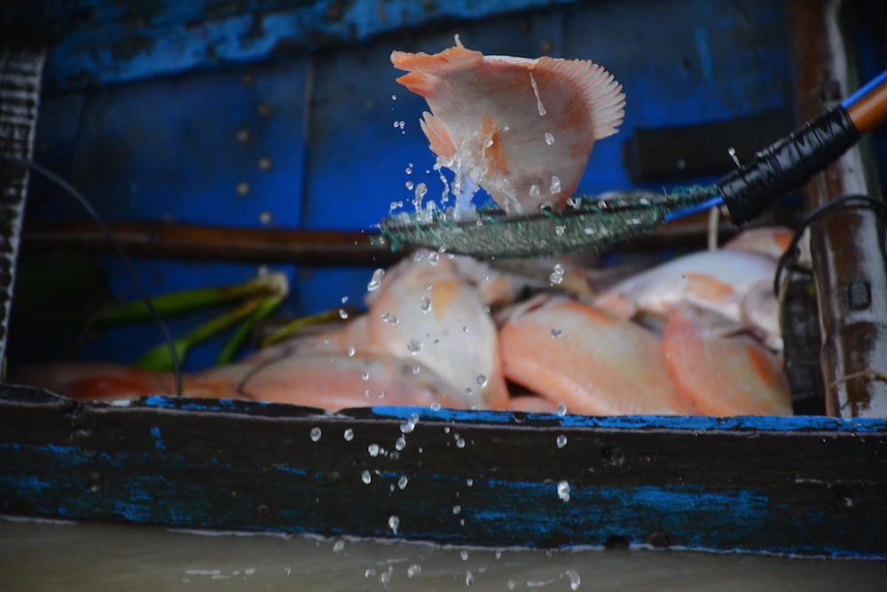 Cá trôi ra sông được người dân vớt lên thuyền. Ảnh: TN