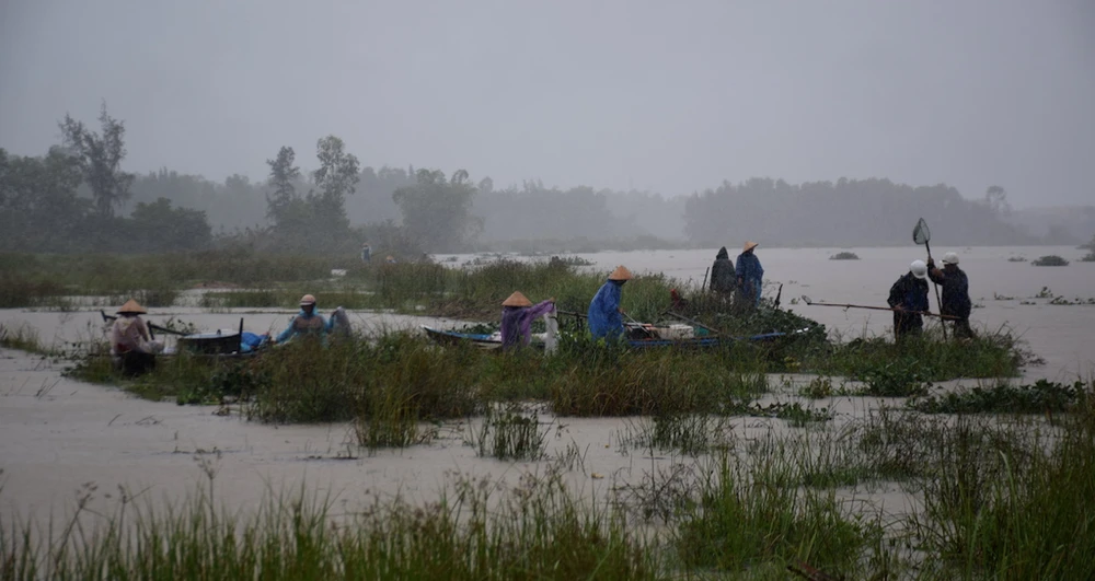 Người thân gia đình anh Ngọc cố gắng tìm vớt số cá tràn ra khỏi lồng. Ảnh: TN