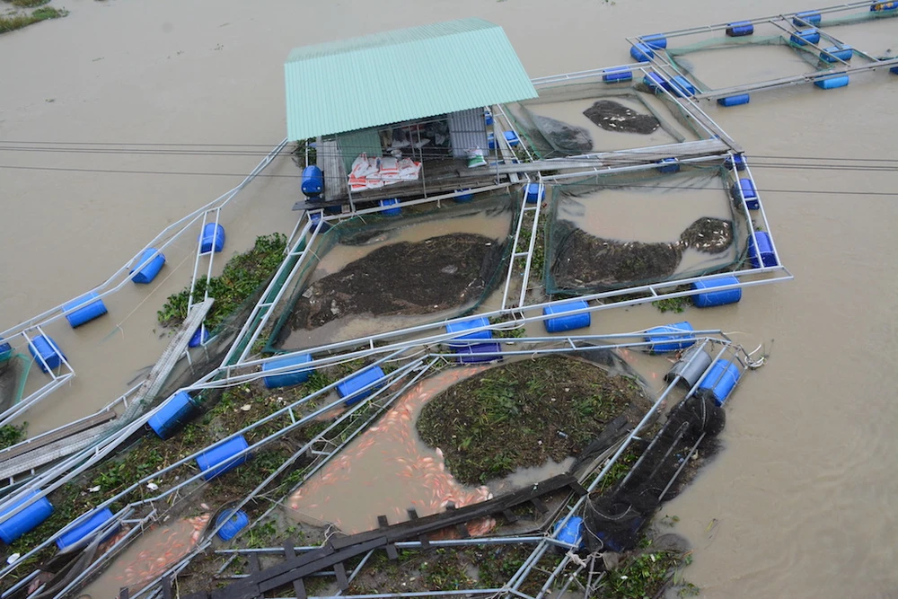 Sáng 9-12, 40 lồng cá diêu hồng trên sông Bàn Thạch đoạn chảy qua phường An Phú (TP Tam Kỳ, Quảng Nam) bị đứt dây neo, cuốn theo dòng lũ.