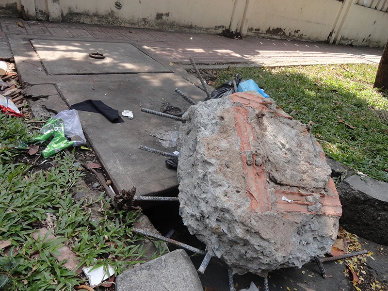 Khối bê tông có sắt nhọn tua tủa xung quanh, rất nguy hiểm cho người và các phương tiện lưu thông trên đường, đặc biệt nguy hiểm với trẻ em và người khiếm thị (ảnh).