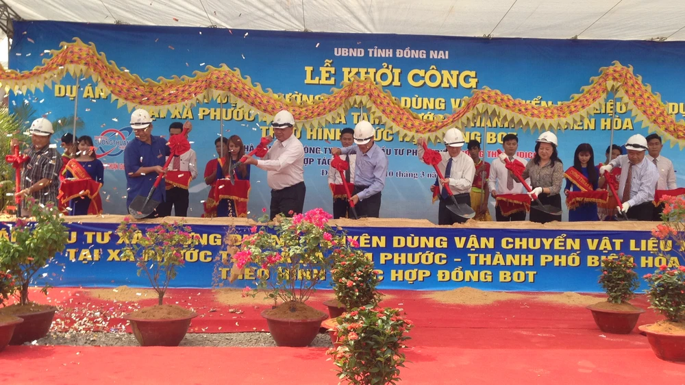Lễ khởi công làm đường chuyên dùng vào mỏ đá Tân Cang. Ảnh: TIẾN DŨNG