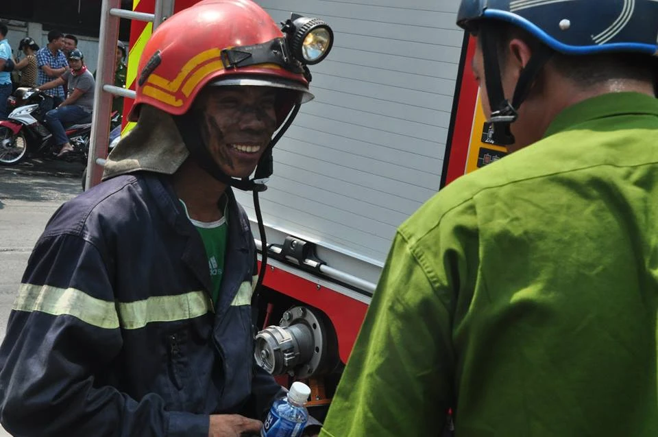Nụ cười của chàng lính cứu hỏa sau khi vụ cháy đã cơ bản được dập tắt.