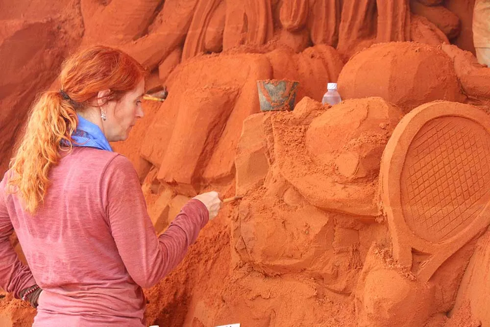 Tại buổi gặp mặt trước đó, các nghệ nhân này cho biết tượng cát làm từ 100% cát tự nhiên, không pha trộn phụ gia và chỉ nhờ sự nén chặt của cát và nước.