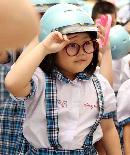 Hình ảnh hợp lệ là hình ảnh phụ huynh/trẻ em đội mũ bảo hiểm đạt chuẩn và đúng cách khi chuẩn bị tham gia giao thông.