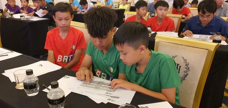 Các cầu thủ nhí đối chiếu lịch thi đấu sau khi bốc thăm chia bảng. Ảnh:TK