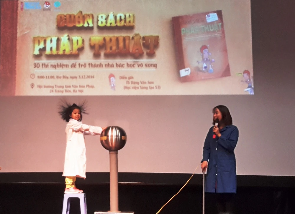 Cũng tại buổi ra mắt sách, các em nhỏ đã được chứng kiến và trải nghiệm các thí nghiệm đầy hấp dẫn của Học viện Sáng tạo S3 như làm tóc dựng đứng, núi lửa phun trào…
