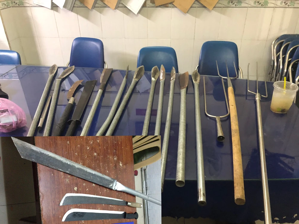 Số tang vật gồm nhiều hung khí bị công an thu giữ. Ảnh: CA