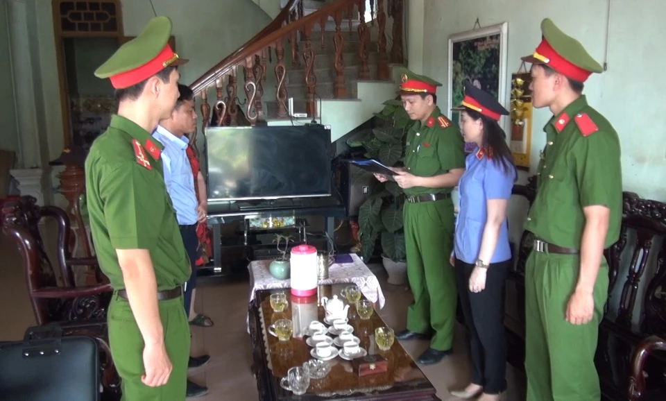 Công an tỉnh Thanh Hóa đọc lệnh khởi tố và thực hiện khám xét khẩn cấp nơi ở của Lê Quang Đức. Ảnh: T.THANH