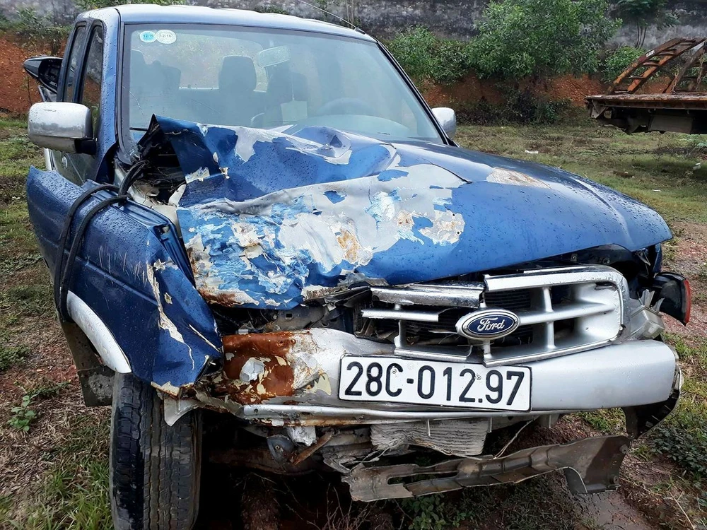 Chiếc ô tô bán tải ông Trung điều khiển bị hư hỏng nặng sau vụ tai nạn .
