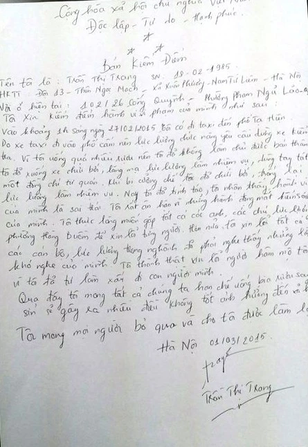 Tôi thực lòng muốn gặp tất cả các anh, các chú lực lượng phường Hàng Buồm để xin lỗi từng người. Hơn nữa, tôi xin lỗi tất cả các cán bộ, lực lượng trong ngành đã phải nghe thấy những lời khó nghe của mình. Tôi thành thật xin lỗi người hâm mộ tôi, vì tôi đã tự làm xấu đi con người mình. Qua đây, tôi mong tất cả chúng ta hạn chế uống bia rượu say xỉn sẽ gây ra nhiều điều không tốt ảnh hưởng đến xã hội. Tôi mong mọi người bỏ qua và cho tôi được làm lại”, trích bản kiểm điểm của Trang Trần viết hôm 1-3.