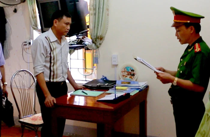 Công an đọc lệnh khởi tố bị can đối với ông Hồ Xuân Tục (trái) và ông Nguyễn Hữu Dương