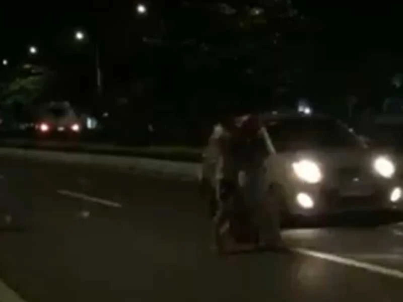 Bị ném nhiều vật vào người, nam thanh niên thoát ra khỏi ô tô, băng sang đường và bất ngờ dùng dao ép một cặp vợ chồng đang chạy xe máy phải dừng lại. Người này dùng dao khống chế người phụ nữ mang bầu, kéo ra giữa đường có nhiều ô tô đang chạy.
