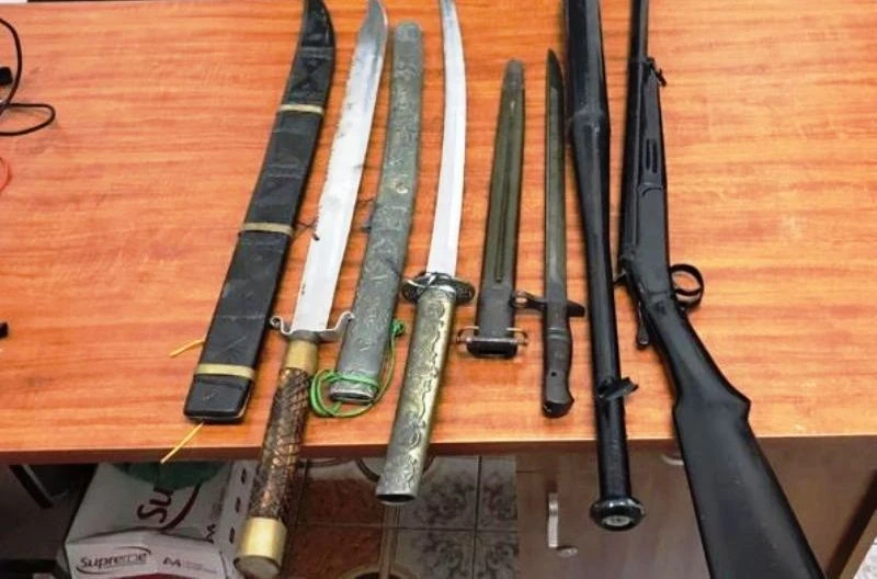 Súng và đao, mác , kiếm thu giữ tại nhà Toàn. Ảnh: CA.