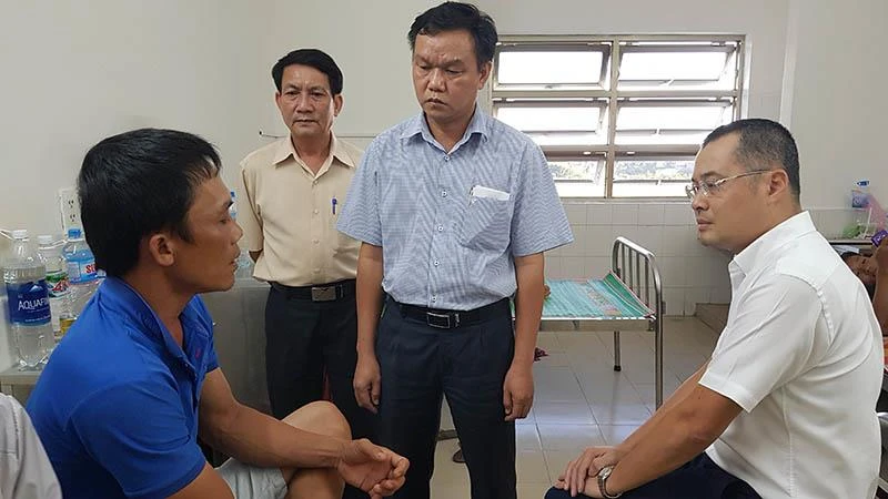 Ông Phạm Đại Dương, Chủ tịch UBND tỉnh Phú Yên (bìa phải) thăm hỏi ông Nguyễn Duy Phương điều trị vết thương tại BV Đa khoa Phú Yên. Ảnh: LL