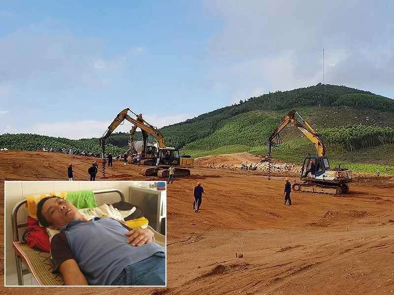 Đơn vị thi công san lấp mặt bằng dự án Nhà máy điện mặt trời Xuân Thọ 1. Ảnh nhỏ: Ông Nguyễn Duy Phương với nhiều vết thương trên người. Ảnh: TẤN LỘC