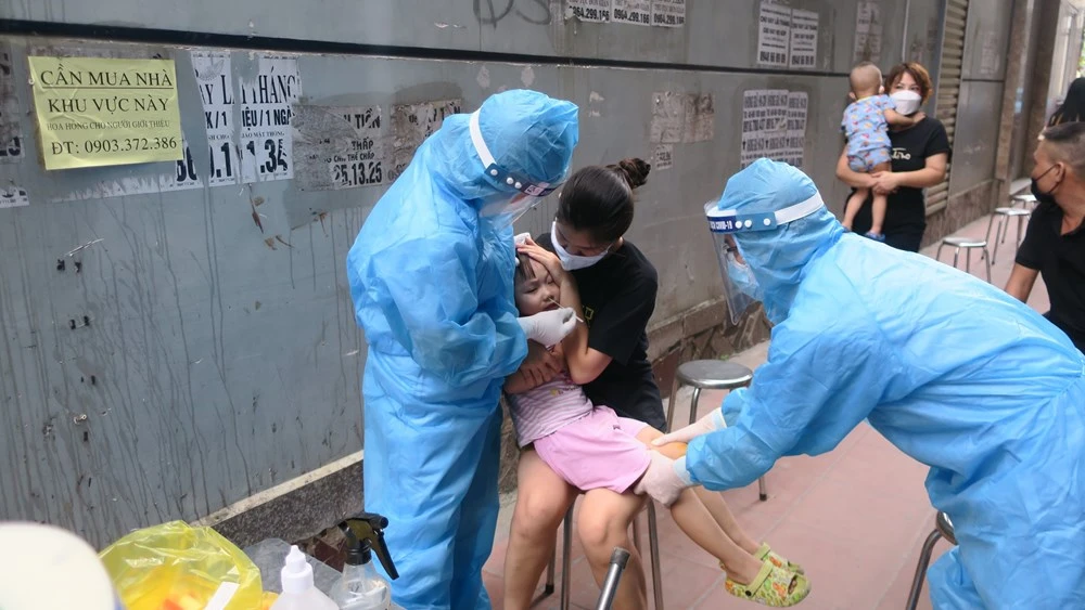 Lực lượng chức năng tổ chức lấy mẫu xét nghiệm tại khu dân cư nhà cháu bé dương tính COVID-19 được đón từ TP HCM về