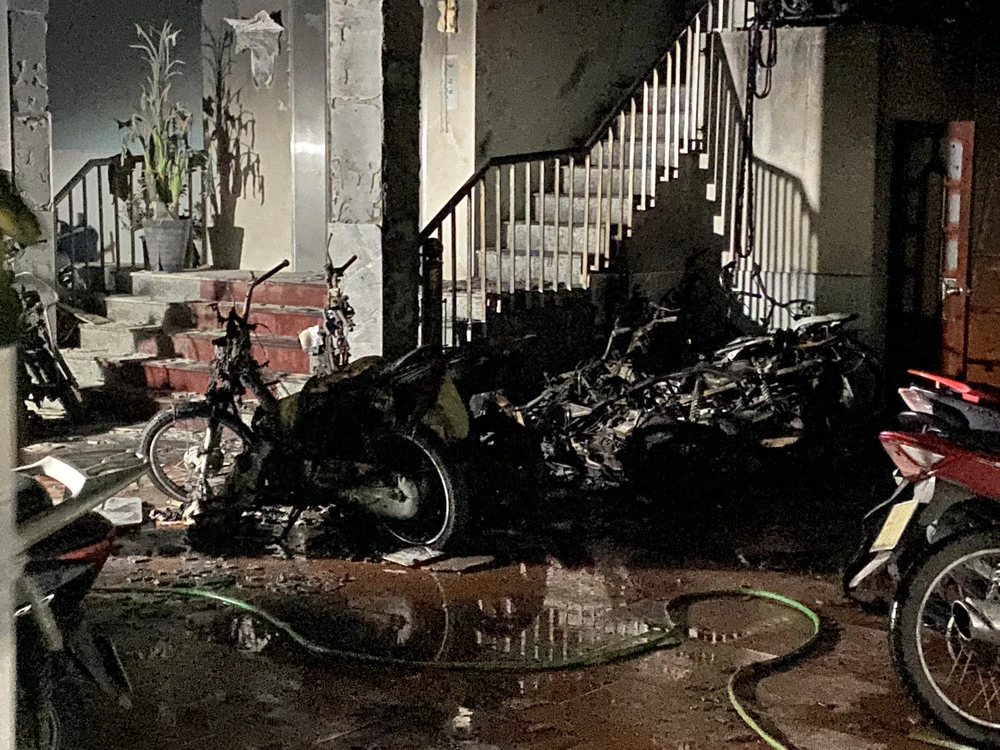 Tại khu để xe ở tầng 1, Hải dùng xăng đổ lên xe máy của anh V. và châm lửa đốt khiến ngọn lửa bùng lên.