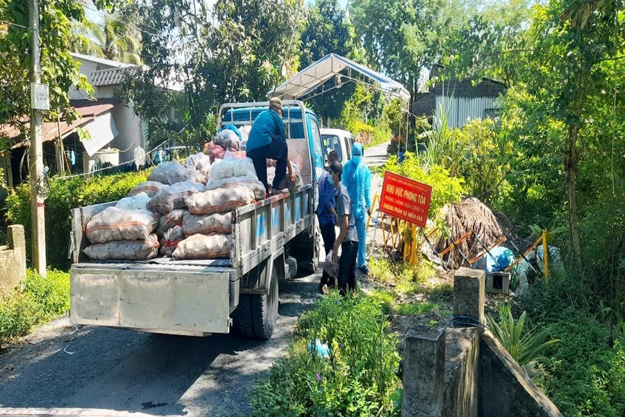 Cứu trợ lương thực thực phẩm cho người dân trong khu cách ly xã Mỹ Hạnh Đông. Ảnh: ĐH