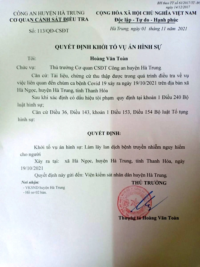 Công an huyện Hà Trung ra quyết định khởi tố vụ án hình sự làm lây lan dịch bệnh truyền nhiễm nguy hiễm cho người. Ảnh: CA