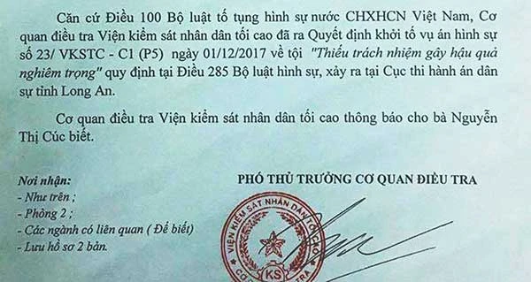 Ngày 7-12, CQĐT VKSND Tối cao đã khởi tố vụ án thiếu trách nhiệm gây hậu quả nghiêm trọng xảy ra tại Cục Thi hành án (THA) dân sự tỉnh Long An. Đây là kết quả sau khi kiểm tra, xác minh tin báo tố giác tội phạm của bà Nguyễn Thị Cúc, Giám đốc Công ty Cổ phần Dệt Long An.