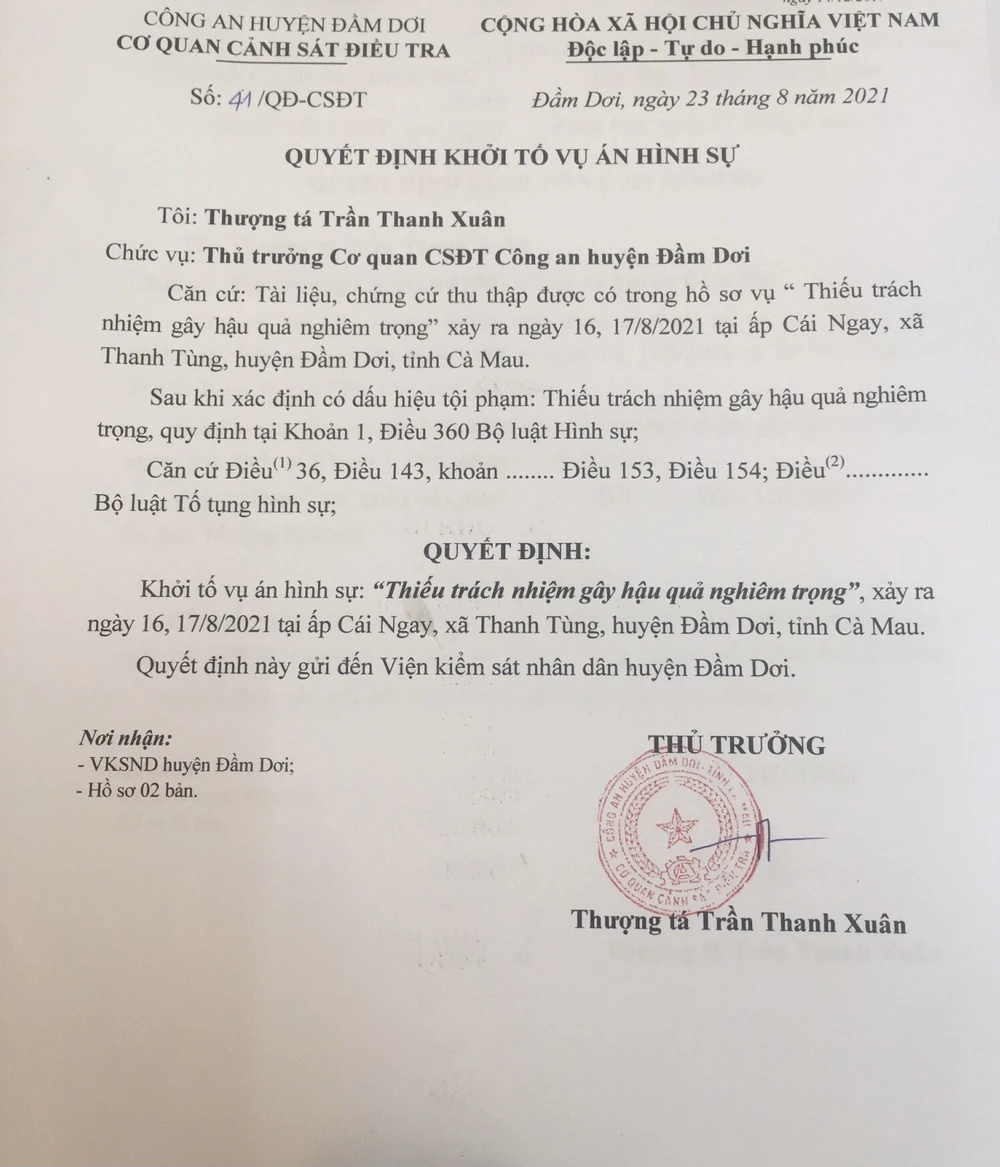 Liên quan đến vụ việc làm lây lan dịch bệnh tại xã Ngọc Chánh và xã Thanh Tùng, huyện Đầm Dơi (tỉnh Cà Mau), sáng 24-8, nguồn tin của PLO cho biết Thượng tá Trần Thanh Xuân, Thủ trưởng Cơ quan CSĐT Công an huyện Đầm Dơi, tỉnh Cà Mau đã khởi tố vụ án “Thiếu trách nhiệm gây hậu quả nghiêm trọng” để điều tra.