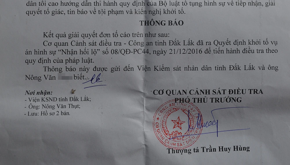 Cơ quan CSĐT Công an tỉnh Đắk Lắk vừa khởi tố vụ án nhận hối lộ xảy ra tại TAND huyện Ea Kar để điều tra theo tố cáo của một người dân tại địa phương này.
