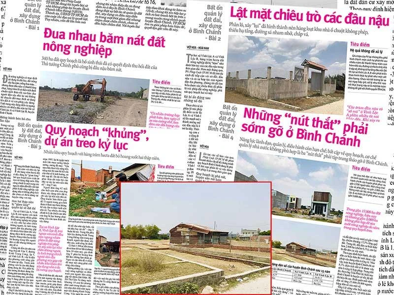| Thành ủy, UBND TP chỉ đạo xử lý Sau khi Pháp Luật TP.HCM đăng tải loạt bài, ngày 22-4, Văn phòng Thành ủy đã có văn bản truyền đạt ý kiến chỉ đạo của phó bí thư Thường trực Thành ủy đề nghị Ban cán sự đảng UBND TP giao Công an TP cùng các đơn vị có liên quan điều tra làm rõ các sai phạm tại huyện Bình Chánh. Đồng thời báo cáo đề xuất Thường trực Thành ủy và Thường trực UBND TP hướng xử lý triệt để nhằm tránh để sai phạm kéo dài, ảnh hưởng đến sự ổn định và phát triển chung của TP. Ngày 2-5, Phó Chủ tịch UBND TP Trần Vĩnh Tuyến đã có văn bản giao Công an TP chủ trì, phối hợp với Thanh tra TP, các sở Xây dựng, TN&MT, QH-KT, NN&PTNT, UBND huyện Bình Chánh, Công an huyện Bình Chánh và các đơn vị có liên quan điều tra làm rõ các sai phạm tại huyện Bình Chánh mà Pháp Luật TP.HCM phản ánh. |