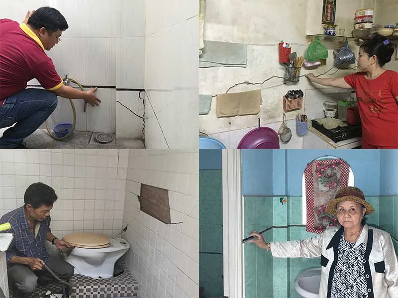 Ông Nguyễn Văn Phụng, nhà số 58/24/20 Tôn Thất Thuyết, bức xúc: “Những vết nứt nhà tôi ngày càng rộng, bồn cầu thì bị sụp xuống, gạch trên tường bị rớt ra từng mảnh”…