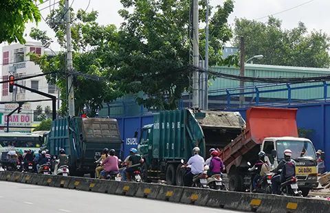Nhiều năm nay, góc ngã ba đường Tân Sơn cắt đường Quang Trung (quận Gò Vấp, TP.HCM) trở thành điểm thu gom rác. Ngay ngã ba này, xe cộ đi lại tấp nập nhưng các xe rác cứ nối đuôi nhau để tiếp nhận rác thành một hàng dài, chiếm hết cả làn đường dành cho xe máy. Mỗi lúc chờ đèn đỏ, ai cũng chỉ muốn mau mau chạy cho thật nhanh để tránh mùi hôi thối. Trên vỉa hè, bao rác lớn nhỏ nằm la liệt, không còn một lối đi nào dành cho người đi bộ.