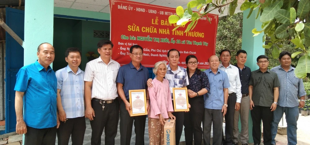 Ông Nguyễn Văn Phụng, nguyên Bí thư huyện Bình Chánh (ở giữa mặc áo xanh) là cầu nối để các doanh nghiệp đến hỗ trợ sửa chữa nhà tình thương ở huyện Củ Chi.