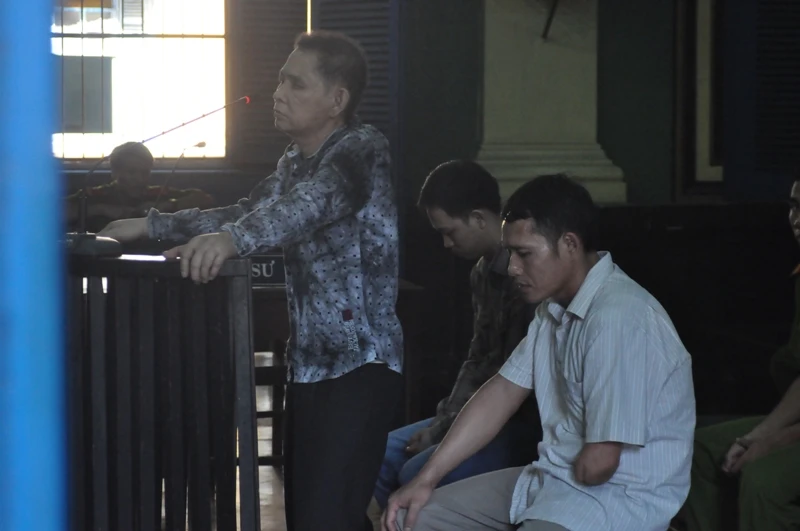 bị cáo Đức (đang đứng), Vĩnh (áo trắng) và Long (áo ca rô) trong phiên xét xử sáng nay. Ảnh : CHU DU