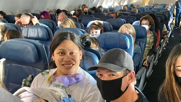 Bác sĩ Dale Glenn chụp hình cùng bà mẹ trẻ Lavi Mounga và em bé Raymond trước khi rời máy bay. Ảnh: HAWAII PACIFIC HEALTH