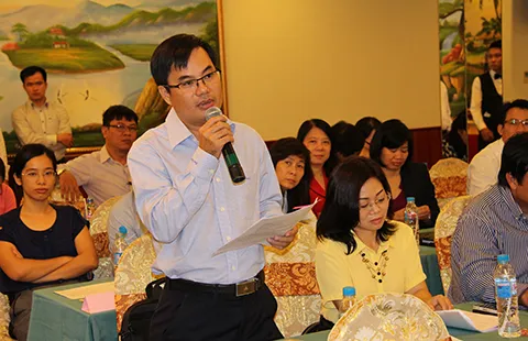 Đại diện một doanh nghiệp đang trao đổi trong một hội nghị đối thoại do Cục THA dân sự TP.HCM tổ chức nhằm tháo gỡ khó khăn trong quá trình THA. Ảnh: KHOA BẢNG