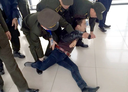 Nam thanh niên gây rối ở sân bay bị lực lượng an ninh khống chế. Ảnh: Otofun