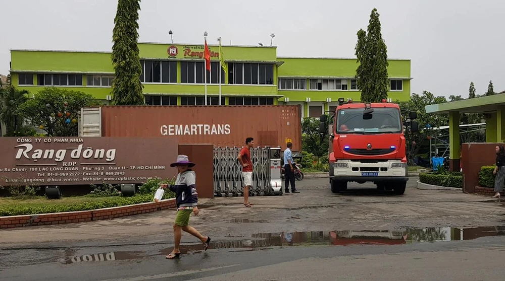 Theo thông tin ban đầu, vào trưa 31-3, bảo vệ và công nhân làm việc tại Công ty Nhựa Rạng Đông trên đường Lạc Long Quân (quận 11, TP.HCM) phát hiện khói lửa xuất phát từ đường ống dẫn dầu cấp nhiệt phía ngoài xưởng nên hô hoán dập lửa.