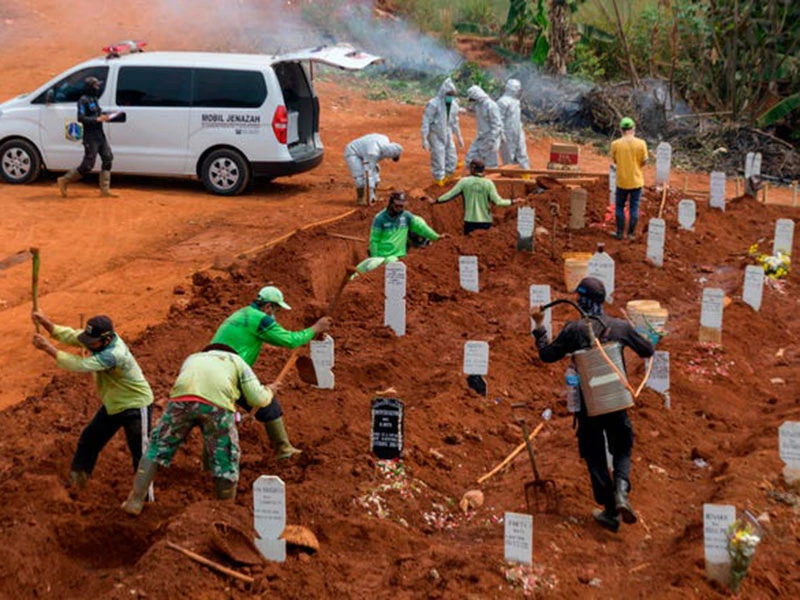 Công nhân đào mộ để chôn người chết vì COVID-19 ở thủ đô Jakarta (Indonesia) ngày 11-9. Ảnh: AFP