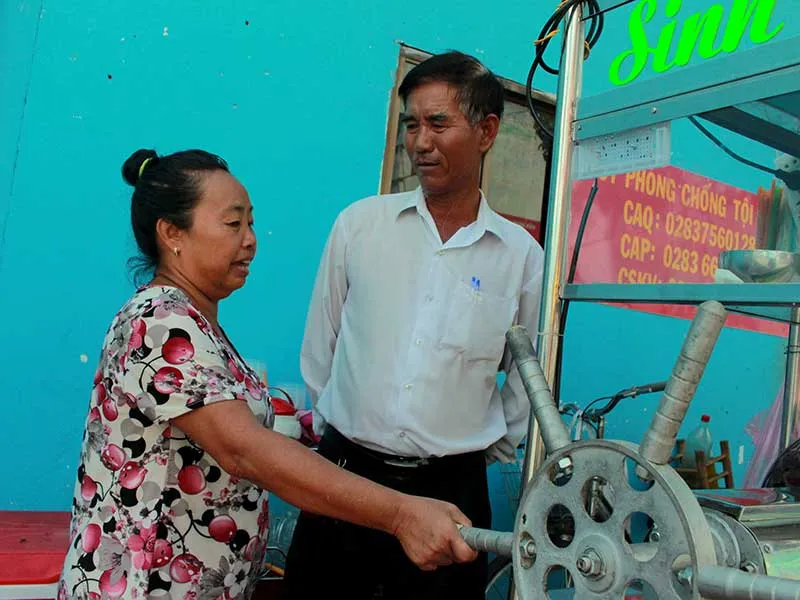 Kế bên xe bánh tráng nướng của chị Lan là xe nước mía của bà Lâm Sú Vân (51 tuổi), được chính quyền hỗ trợ tạo cần câu cơm cho bà Vân sinh sống. Bà Vân kể: “Trước đây tôi làm gia công móc phơi đồ và giúp việc theo giờ, rất cực mà cuộc sống còn khó khăn. Giờ đỡ hơn rồi, khu phố hỗ trợ kiếm mặt bằng, hỗ trợ điện nước bán nước mía cũng kiếm được 100.000-200.000 đồng/ngày”.