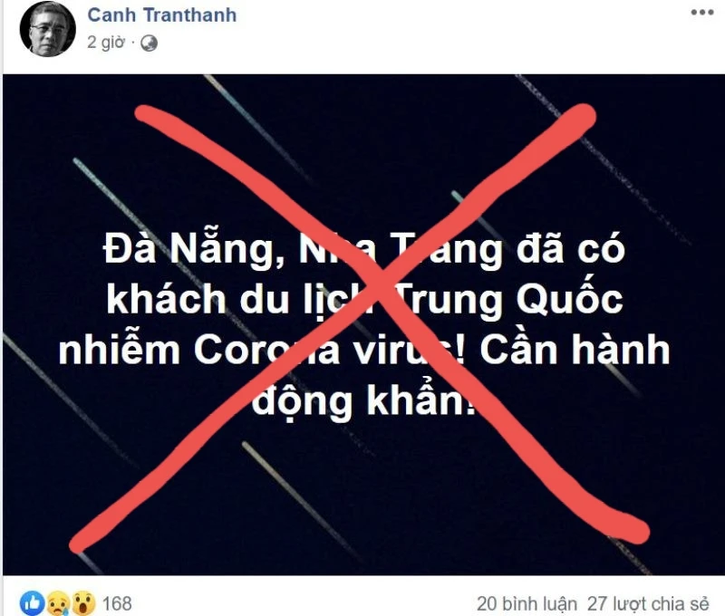 Trước đó, Facebook cá nhân có tên Canh Tranthanh viết: “Đà Nẵng, Nha Trang đã có khách du lịch Trung Quốc nhiễm Corona virus! Cần hành động khẩn!”. Thông tin này nhanh chóng lan truyền trên Facebook, gây hoang mang trong người dân ngày cận tết.