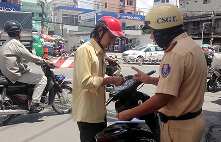 Theo ghi nhận, tại TP.HCM, Phòng CSGT đường bộ-đường sắt ngày 1-7 đồng loạt ra quân kiểm tra, xử lý những trường hợp đi mô tô, xe máy, xe máy điện, xe đạp điện đội mũ bảo hiểm (MBH) “nhái” hoặc đội nhưng không cài quai.