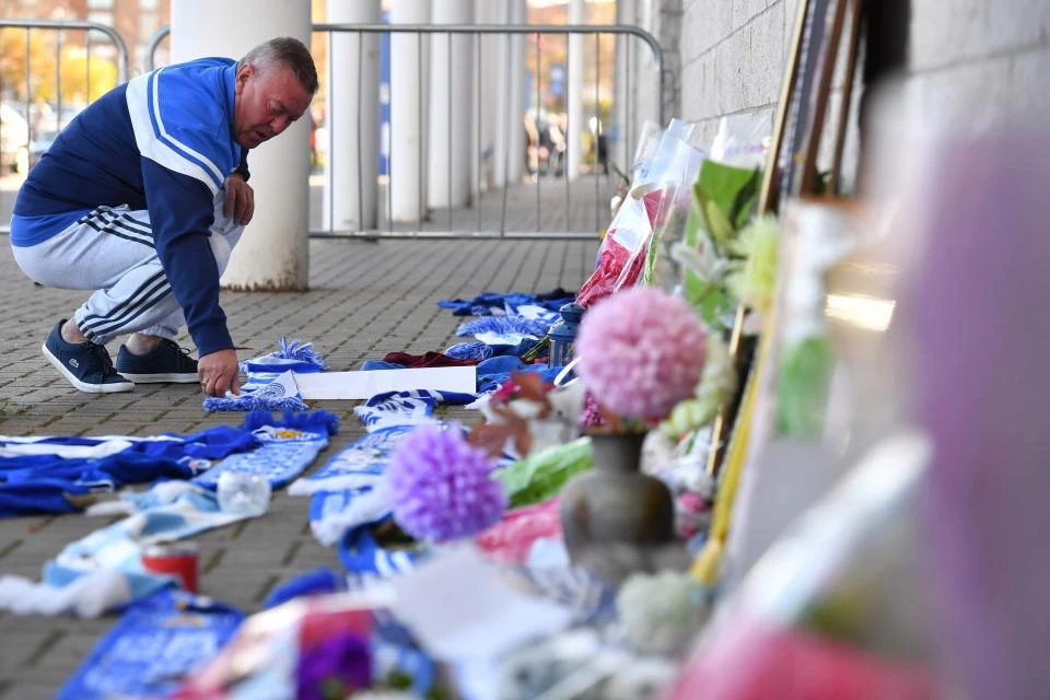 Người hâm mộ Leicester và khách thập phương đổ xô đến sân vận động King Power để đặt những cành hoa sau vụ tai nạn máy bay trực thăng kinh hoàng.