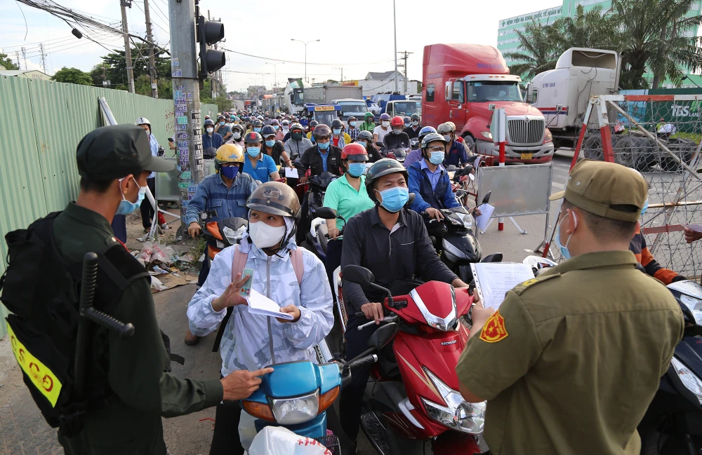 Người dân từ TP.HCM đổ về Bình Dương qua chốt kiểm soát dịch trên Quốc lộ 1K. Ảnh: HOÀNG GIANG