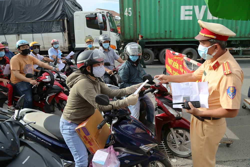 Cảnh sát giao thông kiểm tra giấy tờ của người dân ở khu vực chốt kiểm soát dịch chân cầu Vĩnh Bình. Ảnh: HOÀNG GIANG