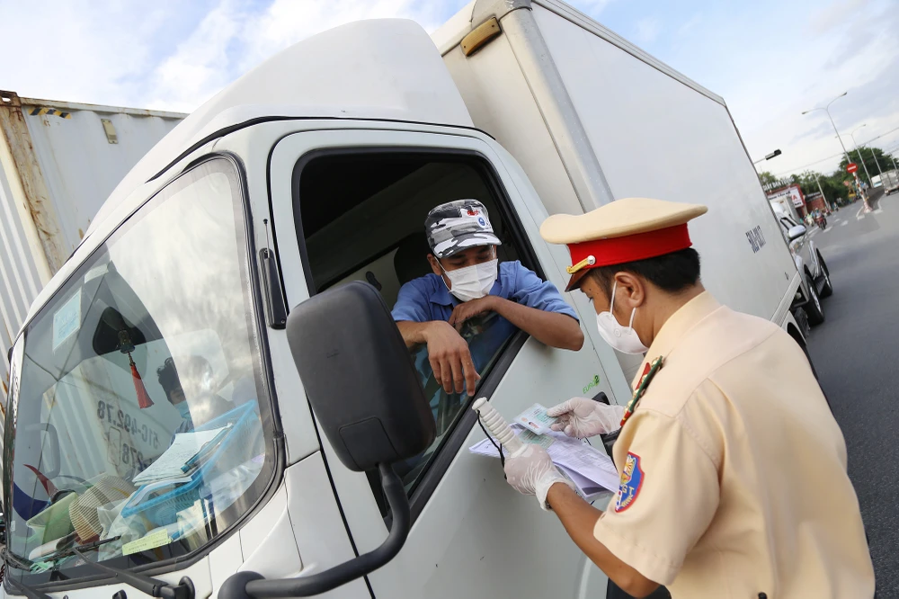 Ngoài giấy xác nhận âm tính với COVID-19, tài xế còn được yêu cầu cung cấp giấy chứng minh nhân dân để CSGT đối chiếu. Ảnh: HOÀNG GIANG