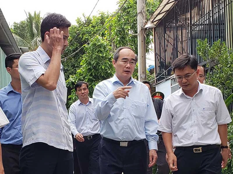Bí thư Thành ủy TP.HCM Nguyễn Thiện Nhân kiểm tra thực địa bảy công trình xây dựng không phép của ông Lê Hữu Thành và người thân tại hẻm 419/14, phường Hiệp Bình Chánh, quận Thủ Đức. Ảnh: TỰ SANG