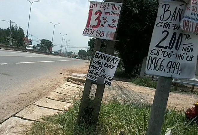 Bảng bán đất được treo khắp các tuyến đường lớn, quốc lộ tại Long Thành, Đồng Nai.Ảnh: Thanh Tình