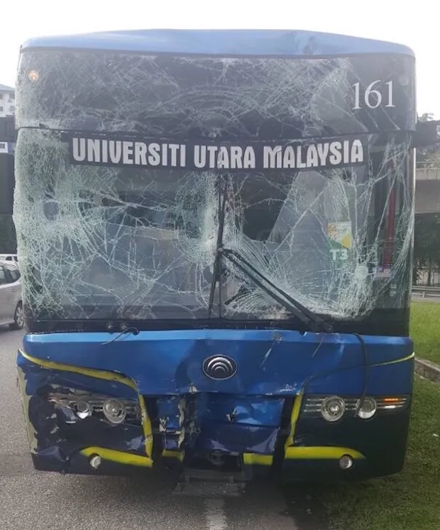 Chiếc xe buýt bị bể kính chắn gió.